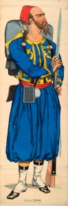 IMAGERIE PELLERIN, à ÉPINAL - Suite de quatre grands panneaux représentant des militaires de l'armée française fin 19e siècle: le zouave, le dragon, le turcos et l'artilleur. Format, environ 200 x 60 cm. NE. Quelques déchirures et manques...