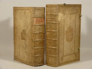 vélin rigide, double encadrement de roulettes dorées ornées d'armoiries aux angles et au centre, dos orné de même, tranches mouchetées, traces de lacets (Reliure hollandaise de l'époque).
