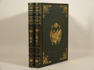 demi-chagrin vert, plats de percaline verte ornée de rinceaux gaufrés en encadrement, armoiries et couronne dorées au centre des plats, dos orné de fers dorés, tranches dorées (Heldt).