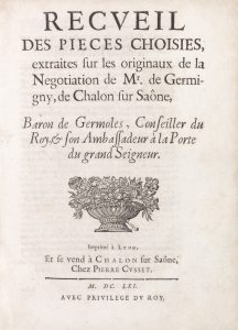 GERMIGNY (Jacques de). Recueil des pieces choisies, extraites sur les originaux de la negociation de Mr de Germigny. Imprimé à Lyon ; Chalon sur Saône, Pierre Cusset, 1661. In-4,