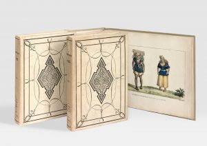 cartonnage de papier crème, plats des volumes de texte ornés de décors géométriques imprimés en noir, titre gravé sur le plat supérieur de l'atlas, dos lisses, non rogné (Reliure de l'éditeur).