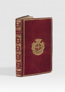 maroquin rouge, triple filet doré, armoiries au centre, dos lisse orné, filet sur les coupes, dentelle intérieure dorée, doublures et gardes de papier d'Augsbourg, tranches dorées (Reliure de l'époque).