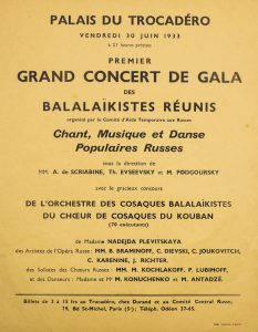 Paris, 1933.Афиша: «Первый гала концерт». Париж, 1933 г. - Русские популярные песни, музыка и танцы – при участии всеобщего кумира Белой эмиграции Надежды Плевицкой, осужденной в 1937 г. французским судом на 20 лет каторги за участие в похищении генерала Евгения Миллера. Умерла в тюрьме в 1940 г. 27 х 21 см. Большая редкость.