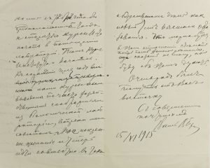 L.A.S. à un collègue. 15 juin 1915. - 3 pp. in-8. En russe. БЕХТЕРЕВ Владимир Михайлович (1857-1927). Собственноручное письмо к неизвестному. Б.м., 15 июня 1915 г. - 3 стр. ; 21 х 13 см. - Бумага, чернила. Бехтерев обсуждает курс, который он будет вести, в т.ч. упоминает П. Ф. Лесгафта.