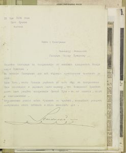 NICOLAS Nicolaevitch de Russie. 1856-1929. Dossier souvenir provenant des archives du Musée du L.G. Atamanski. 3 télégrammes adressés au Général Khripounoff, signés de la main du Grand-duc. Joint: 20 pp. d’extraits de journaux russes et français sur le décés du Grand-duc Nicolas de Russie et ses obsèques en 1929...