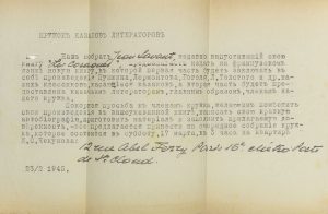 .... ТУРОВЕРОВ Николай Николаевич (1899-1972) Письмо к членам Кружка казаков-литераторов. Париж, 23 февраля 1945 г. - 1 л. ; 20,5 х 13,5 см. - Машинопись с рукописными вставками Н. Туроверова (коричневые чернила). Туроверов оповещает членов Кружка о готовящемся издании литературного сборника, посвященного казачеству (издатель - «собрат» Жан Саван) и приглашает участвовать в нем. ЧЕКУНОВ Иван Степанович (1874-1956). Доктор медицины, казак станицы Раздорской Донской области. Участник мировой и Гражданской войн в качестве врача. Интересный документ из истории деятельности Кружка казаков-литераторов. Провенанс: из наследия Н.Н. ТУРОВЕРОВА (1899-1972).