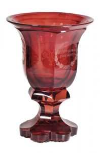 Vaste décor gravé « Colonne d’Alexandre » et l’inscription en caractères cyrilliques : « A Alexandre Ier, la Russie reconnaissante 1834 ». Saint-Pétersbourg. Manufacture Impériale de verre, vers 1834. Hauteur : 15,5 cm. Памятный кубок в честь сооружения « Александровской колонны ». Рубиновое стекло, гравированное изображение « Александровской колонны » и надпись : « Александру Первому благодарная Россия 1834 ». Высота : 15,5 см. Императорский стеклянный завод. 1834.