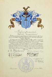 Adresse de félicitations de la part du Conseil de l’Union de la noblesse russe pour les 50 ans de service militaire du Général Arsène GOULEVITCH. 1935 Gouache, encre de Chine. 32,5 x 22,5 cm. Signée en bas au centre par les initiales en caractères cyrilliques, localisée Paris et datée 1935. ЕФРЕМОВ, Степан Федорович (1878-1942) ПОЗДРАВИТЕЛЬНЫЙ АДРЕС генерал-майору А. А. ГУЛЕВИЧУ к 50-летнему юбилею служения на боевом и ученом поприще от Совета Союза русских дворян. 1935 Гуашь, тушь. 32,5 x 22,5 Париж, 6 октября 1935 г. Внизу в центре инициалы «С.Е.». Изображение герба Гулевичей (Смоленская ветвь); «Герб Новина». Герб этот пожалован в 1121 г. кор. Болеславом Кривоустым ротмистру, который в плену был закован в одну с Болеславом колоду и, чтобы развязать узы, отсек себе ногу и т.о. освободил короля. Герб известен в Великом княжестве Лиовском после подписания Городельской унии в 1413 г. Подписи: 1) Трубецкой, Владимир Петрович, князь (1885-1954). Подъесаул Л.Гв. казачьего полка, общественный деятель. 2) Тенишев, Вячеслав Вячеславович, князь (1878-1959). Юрист, общественный деятель, коллекционер; товарищ председателя Союза рус. дворян. 3) Олсуфьев, Дмитрий Адамович, граф (1862-1937). Подпоручик, геолог, гос,, общ. и церковный деятель, масон. 4) Нератов, Анатолий Анатольевич (1863-1938). Гофмейстер, действ. статский советник, дипломат. 5) Менделеев Павел Павлович (1863-1951). Тайный советник, правовед, редседатель Союза рус. дворян. 6) Мещерский Петр Николаевич, князь (1869-1944). Полковник Л.Гв. Гусарского полка. 7) Зилоти Сергей Сергеевич (1907-1992). Общ. деятель. 8) Савич Яков Иванович (1870-1949). Коллежский регистратор, финансист, юрист, общ. деятель. 9) Алексеев, Григорий Александрович (1886-1961). Надворный советник, секретарь и управляющий Союза рус. дворян. 10) Ефремов Степан Федорович (1878-1942). Лейб-казак Донского войска, титулярный советник, художник.