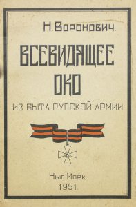 Les jours et les travaux de l’Armée Russe. New-York, 1951. ВОРОНОВИЧ, Николай Владимирович (1887-1967). Всевидящее око: Из быта Русской армии / Обл. и рис. в тексте автора.Нью-Йорк, 1951. - 75 с., [9] л. ил., портр.: ил.; 22 см. - Изд. илл. обложка (ничтожные загрязнения и надрыв). Отпечатано множительным аппаратом. Многочислен. иллюстрации. Автор - оригинальный тип русского офицера. Окончил привилегированный Пажеский корпус, служил в лейб-гвардии Конном гренадерском полку. Участвовал в Русско-японской и Мировой войнах. В Гражданскую войну командовал отрядом «зеленых» и воевал против Добровольческой армии. В 1920 бежал через Константинополь в Чехословакию, затем перебрался во Францию. В конце 1940-х уехал в США и принял сан диакона.