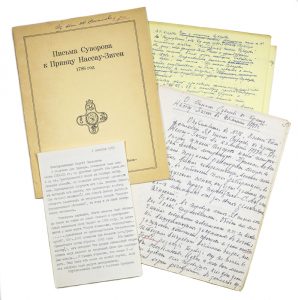 Письма А.В. Суворова к принцу Нассау-Зиген. 1788 год. Париж, 1965. - 32 с.; 27 см. - (Военно-историческая библиотека военной были № 10). - Изд. обл. Тираж 200 экз. Наш экз. № 41. Отпечатано на мелованной бумаге. Влад.инскрипт: «Из книг А. Васильева». Номер с тридцатью девятью никогда не печатавшихся писем А.В.Суворова, в бытность его начальником Кинбурского отряда и адресованных принцу Нассау – Зиген. Первое факсимильное издание писем А. В. Суворова на французском языке с русским переводом С. Андоленко. Редкость. На обл. влад. подпись. Спометками/исправлениями, дополнениями в тексте Прилагаются: Три письма критического содержания по поводу перевода. 1. Письмо (машинопись) Ю. Топоркова. 2 стр. 2. «О письмах Суворова к Принцу Нассау - Зиген в кампанию 1787 г.». Собственноручное письмо/правка Ивана Саг…. кин (неразборчиво). 10 стр. Исправление перевода С. Андоленко. 3. 2 листа (без подписи, но, вероятно, С. Андоленко) о первых изданиях писем. Топорков Юрий Александрович (? -1970,Франция). Полковник, историк, редактор, общественный деятель. Участник мировой и Гражданской войны, служил в инженерном полку. В эмиграции с 1920-х, жил в Париже. Член Гвардейского объединения во Франции. С 1946 до конца 1960-х член правления Кружка (Общества) любителей русской военной старины, почетный член Общества (с 1963). С 1959 по 1970 редактор «Военно- исторического вестника». С 1958 член совета Союз ревнителей памяти императора Николая II. Провенанс: экз. из собрания генерала С. Андоленко.