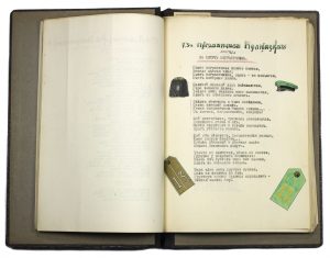 Recueil de chansons militaires russes. Tapuscrit. Dessins originaux. АНДОЛЕНКО Сергей Павлович (1907-1973), генерал [Сбоник песен полков российской армии и другие военные песни (наполеоновские войны, первая мировая война, гражданская война).] Переплет. 96 песен. Машинопись. Некоторые названия песен раскрашены от руки. Цветные рисунки на полях страниц. Провенанс: экз. из собрания генерала С. Андоленко.