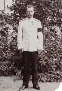 Царь Николай II в военном мундире с орденом и траурной повязкой. Дания. Бернсторф. 1899 г. 10 х 14,3 см. На самом снимке вытеснена фамилия фотографа. 28 июня 1899 года, в возрасте 28 лет, скончался наследник цесаревич Георгий Александрович Романов, брат Николая II и третий сын Александра III и Марии Федоровны. Cо следами отклеивания из альбома. Оторван правый уголок прим. на 1 см.
