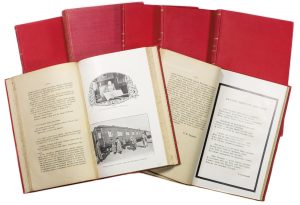 Paris, 1921-1925. Livres 1-7. Complète en 7 volumes in-4°, illustrations hors-texte. РУССКАЯ ЛЕТОПИСЬ : (с 1917 г.). – Вып. 1-7 [комплект]. Париж : Изд. «Русского очага» в Париже, 1921-1925. - 7 тт.: ил. (портр.) ; 25 см. – Илл. изд. обложки сохранены под 7-ю красными перкалиновыми переплетами с зол. тиснением по корешку. Многочисленные рукописные пометки и дополнения. Влад. инскрипт: «А. Петровъ». Историческое иллюстрированное издание, посвященное памяти последнего Государя и его семейства. РЕДКОСТЬ в комплекте. Fekula 3430. Провенанс: Игумен Афанасий (в миру ПЕТРОВ Александр Александрович; 1892 – конец 1960-х). CORRIGENDUM. Изд. обложка сохранена только для 1-го тома.