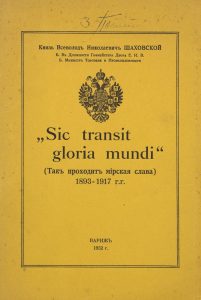 Sic transit gloria mundi, 1893-1917. Paris, 1952.ШАХОВСКОЙ Всеволод Николаевич, князь (1874–1954) "Sic transit gloria mundi" : (Так проходит мирская слава), 1893-1917 гг. Париж : [б. и.], 1952. - 214, [4] с.; 25 см. - Илл. изд. обложка. Влад. инскрипт: «В. Потаповъ».На стр. 86-87 - читательские пометки (рассказ автора «о крайней сомнительности» в верности императору генерала Алексеева и проч.). Здесь же вложена вырезка из газеты «Русская мысль» о жизни Николая II в Могилеве (1967). Автор: Лейтенант флота, действительный статский советник, гофмейстер, церковный деятель. В 1915 назначен управляющим Министерством торговли и промышленности. В 1919 эмигрировал в Данию, в 1920 приехал во Францию. Землевладелец, жил преимущественно в своем имении около г. Тур. Занимался разведением пчел. Один из основателей православного прихода в Туре, был его почетным попечителем, старостой и представителем на Епархиальных съездах. Был директором церковной школы. В Париже бывал наездами. Единственная книга мемуаров князя Шаховского. Редка! Провенанс: ПОТАПОВ Владимир Константинович (1881 – 1968). Капитан I ранга, гидрограф, общественный деятель. Во время мировой войны начальник обороны русских устьев Дуная. В его честь «Потаповским» назван судоходный канал в устье Дуная. Во время Гражданской войны служил на Черноморском флоте. В 1921 находился в составе Русской эскадры в Бизерте (Тунис). Работал шофером такси, был рабочим на заводе Renault. С 1928 член Военно-морского исторического кружка.
