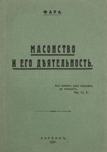La Maçonnerie et son activité, Harbin, Loukine, 1937, 98 p. Broché, en parfait état, non coupé. Savine : Très grande ra- reté. ФАРА МАУРИК Масонство и его деятельность. Харбин, 1937. - 98 с.; 19 см. - Изд. шрифт. обложка. Издание не обнаружено в каталогах РНБ и РГБ. Цена по каталогу А. Савина - 2000 фр. ОЧЕНЬ БОЛЬШАЯ РЕДКОСТЬ в коллекционной сохранности.