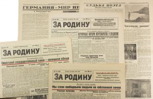 Riga, juillet, août, décembre 1943. Très rare. [РУССКАЯ ОСВОБОДИТЕЛЬНАЯ АРМИЯ] Подборка из пяти номеров газеты «ЗА РОДИНУ!». №№ 172, 174, 186, 201 и 284. Рига, июль, август, декабрь 1943. Гл. редактор – Анатолий Григорьевич СТЕНРОС (наст. Макриди, 1902-1982), участник Белого движения (первопроходник), художник-карикатурист. В коллекционном состоянии. Большая редкость.