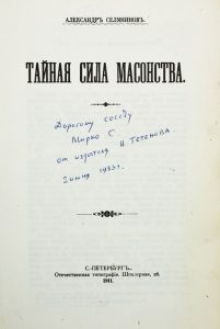 La force secrète de la maçonnerie, réédition anastatique de l’édition de Saint-Pétersbourg de 1911. Broché. Envoi de l’éditeur Nicolas Ivanovich Tetenov (1937-2004), penseur du nationalisme russe. СЕЛЯНИНОВ, Александр Тайная сила масонства. Б. м.: Н. Тетенов, б. г. [1983]. - 294 с.; 20 см. - [Репринт. воспроизведение изд. 1911 г.] Изд. обложка. Подчеркивания. На тит. листе инскрипт издателя Н. И. ТЕТЕНОВА (1937-2004), русского эмигранта еврейского происхождения, ставшего яростным противником «иудео-масонства».