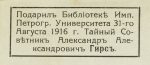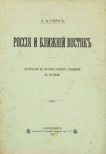 La Russie et le Proche Orient. Sur l’histoire de nos relations avec la Turquie. Saint-Pétersbourg, 1906. ГИРС, Александр Александрович (1850-1923) Россия и Ближний Восток : Материалы по истории наших отношений с Турцией. Санкт-Петербург: тип. А.С. Суворина, 1906. - IV, 218, [2] с. ; 22,5 см. - Изд. шрифтовая обложка (фоксинги). На с. 1 приклеена этикетка, свидетельствующая о том, что книга была подарена автором библиотеке Петроградского Университета 31 августа 1916 г. Очень хорошая сохранность. Неразрезанный экз. В книге рассказывается о трех главнейших эпохах в отношениях России с империей Османов: Екатерининской, Крымской войны и войны 1877-1878 гг. Автор : видный российский дипломат и историк. Сын действительного тайного советника, сенатора А. К. Гирса, бывшего товарищем министра финансов; племянник министра иностранных дел при Александре III Н. К. Гирса. Работал консулом в Триесте, Румынии, Каннах, Бушире, Салониках, был посланником в Черногории, возглавлял Отдел печати Министерства иностранных дел Российской Империи и Санкт-Петербургское Телеграфное Агентство (СПА). После 1917 г. находился в эмиграции. Весьма редка (цена в магазине «Русский библиофил» - 170000 руб.). Международная книга, 71-199.
