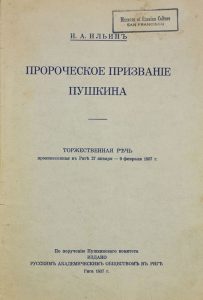 La vocation prophétique de Pouchkine. Riga, 1937. ИЛЬИН, Иван Александрович (1883-1954) Пророческое призвание Пушкина: Торжественная речь, произнесенная в Риге 27 января - 9 февраля 1937 г. Рига : Русское Академ. об-во, 1937. - 43 с.; 22 см. - Изд. шрифт. обложка. Штемельный экслибрис «Музея русской культуры» (Сан-Франциско). Редка.