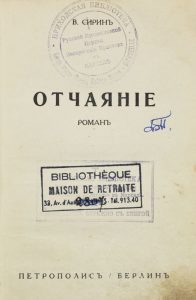 La Méprise. Berlin, Petropolis, [1936]. 12°, relié. Sans couverture d’éditeur. ÉDITION ORIGINALE. Très rare. СИРИН, В. (НАБОКОВ, Владимир Владимирович (1899-1977) Отчаяние : роман / В. Сирин. Берлин : Петрополис, [1936]. - 201, [2] с.; 17,5 см. - В составном переплёте эпохи. Без изд. обложки. Временные пятна. Владельческий инскрипт («Ф.П.») и штемпельные экслибрисы: 1) Приходской биб-ки Русской православной церкви Воскресения Христова в Марселе; 2) Русского дома престарелых в Каннах. ПЕРВОЕ ИЗДАНИЕ одного из самых мастерских и «безнадежых» романов В. В. Набокова-Сирина. Очень большая редкость (цена по каталогу А.Савина - 2750 франков). Экземпляр «Отчаяния» был представлен в каталоге «Библиотека Набокова» аукционного дома Tajan (Женева, 2004). Juliar A15.1. Tajan: Bibliothèque Nabokov 13.