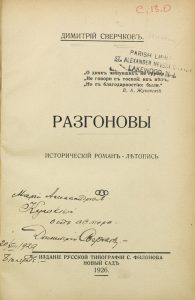 Les Razgonov. Roman-chronique. Envoi autographe de l’auteur. СВЕРЧКОВ, Димитрий Исидорович (1874-1934) [-автограф] Разгоновы : Ист. роман-летопись. Новый Сад : Рус. тип. С.Филонова, 1926. - 253 с. ; 20 см. - Составной переплет эпохи с бинтами и зол. тиснением по корешку. Щелковое ляссе. Экслибрис Приходской биб-ки церкви Св. Александра Невского. Авторский инскрипт Марии Александровне Кулаковой (1929, Белград). Автор: воен. деятель, литератор. Участвовал в Русско-японской, Первой мировой и Гражданской войнах. В эмиграции в Югославии, с конца 1920-х гг. - во Франции. Все романы Сверчкова имеют биографический характер.ПЕРВАЯ КНИГА писателя. Редка; отсутствует у А.Савина.