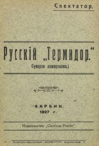 Le thermidor russe. Le crépuscule du communisme. Harbin, 1927. СПЕКТАТОР. Русский «Термидор»: Сумерки коммунизма. Харбин: изд-во «Свобода России», 1927. - 187 с.; 18,5 см. - Изд. шрифт. обложка. Имя автора, скрывшегося под псевдонимом «Спектатор» («Обозреватель»), установить не удалось. Несомненно, что часть материала для своей книги он собирал непосредственно в Советской России. Не исключена его близость к евразийцам. Представлена единственная известная нам книга, выпущенная издательством «Свободная Россия». «Книги, изданные в Китае, сейчас стали большой редкостью, их остались считанные единицы» (А. Савин). Редкость, как и все книги «русского Китая» (цена по каталогу А. Савина: 1250 фр.).