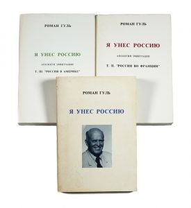 J’ai apporté la Russie avec moi. Une apologie de l’émigration. New-York, 1981-1989. 3 vol. in-8. ГУЛЬ, Роман Борисович (1896-1986) Я унес Россию : Апология эмиграции. - Т. 1-3. Нью-Йорк : Мост, 1981-1989. - 3 тт.: ил. ; 20 см. Т. 1: Россия в Германии. - 1981. - 365 с. : ил., портр. Т. 2: Россия во Франции. - 1984. - 351 с. : портр. Т. 3: Россия в Америке. - 1989. - 400 с. : ил., портр., факс. В шрифтовых изд. обложках. Отличная сохранность. Итоговая книга мемуаров Р. Гуля. Отсутствует у А. Савина. Редка в комплекте.