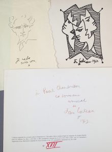 des 25 de tête (N° XVII) augmentés d'une illustration originale de Jean Cocteau. Bel envoi signé de Jean Cocteau à Paul Chambrillon, écrit avec crayons de couleurs rouges, verts et bleus. Envoi signé d'Alain Saury et de Béatrice (sa compagne ?), au même. Message d'accompagnement signé de Saury (sur un feuillet in-4 kraft lacunaire) : " Cher Paul, ce livre est pour vous […] Cocteau vous y a mis un petit mot […] ".