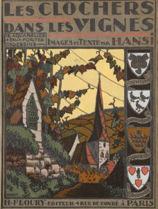 HANSI (Jean-Jacques Waltz, dit). Les clochers dans les vignes. Aquarelles, eaux-fortes et dessins de l'auteur. Paris, Floury, 1929. In-4, demi-basane marbrée fauve, dos à 4 nerfs, auteur et titre dorés, couv. illustrée et dos conservés (leg....