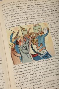 Texte, illustration, calligraphie du couple d'artistes Jean Target (1910-1997) et Odette Bruriaux (1923-2003). Très beau manuscrit d'un roman folklorique inédit, émaillé de nombreux termes de patois du centre-ouest et orné de belles illustrations à l'encre et à l'aquarelle, dont seules les plus grandes, à pleine page, sont signées par Jean Target. L'histoire se situe sous la Troisième République, avant la Grande Guerre, dans un village des campagnes poitevines ou vendéennes, nommé Puytruand, dont les habitants - César, Môssieur le médecin, la mère Crevette, saint Orémus, la Hurlotte... - sont les acteurs principaux. Dans les environs grandit la crainte de voir surgir la bigourne, bête terrifiante de la région.
