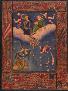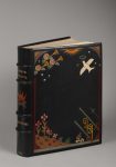 mosaïquée parlante au plat supérieur (épées, fleurs, anges colombe en écoinçons), guerrier mosaïqué au centre du plat inférieur, filet doré aux coupes, contreplats doublés de maroquin citron avec listel bordeaux et fleurs angulaires, le tout mosaïqué, première et dernière gardes ornées chacune d'une peinture sur soie différente, autre garde de papier marbré, chemise et étui [G. Levitzky] (dos de la chemise passé et un peu frotté).