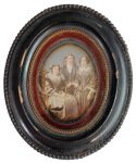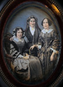 DAGUERRÉOTYPE. Portrait de trois femmes, années 1850. Daguerréotype ovalisé. À vue : 14,7 × 10,6 cm. Cadre en bois noirci : 26 × 21,5 cm. La subtilité et la finesse des rehauts de couleurs et d'or mettent en valeur la richesse des détails...