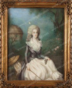 BURETTE M. L. Ecole française de la fin XIXe/début du XXe siècle. D'après une œuvre de François DUMONT. La reine Marie Antoinette en habit de chasse, vers 1779. Miniature sur ivoire, de forme rectangulaire, signée en bas à droite, la...
