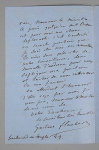 Flaubert précise l'objet de l'accusation, " … accusé d'avoir, " par un roman publié dans la Revue de Paris, attenté aux bonnes mœurs et à la religion ", et se défend d'avoir eu de telles intentions. Il sollicite donc " dix minutes d'audience pour vous expliquer ma position et tenter de vous intéresser en ma faveur ". Le destinataire a fait répondre (annotation de sa main) le 5 janvier qu'il acceptait de recevoir le romancier, après avoir pris connaissance des faits.
