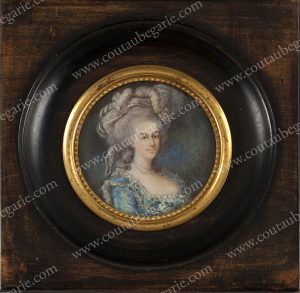 ECOLE FRANCAISE DU XXe SIECLE. D'après une œuvre de Madame Elisabeth VIGEE-LEBRUN. La reine Marie-Antoinette à la rose, vers 1783. Miniature sur ivoire, de forme ronde, la représentant en buste, conservée sous verre dans un encadrement en bois...