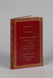 et filets dorés, plats bordés d'un jeu de filets et roulettes dorés, avec au plat sup. un ex-dono doré au ministre G. Rouland, un médaillon aux petits fers au plat inf., pointillé aux coupes, roulette intérieure, tête dorée (frottements en pied des contreplats).
