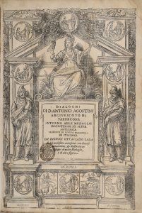 AGUSTÍN (Antonio). Dialoghi…intorno alle medaglie inscrittioni et altre antichita. [Au colophon] In Roma, appresso F. de Rossi, 1650. In-folio, [10] f. (dont le titre dans un encadrement gravé sur bois), 318 p., [19] f. (index), 1 planche gravée...