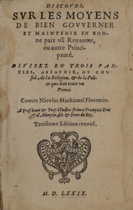 [Livre du XVIe s.]. [GENTILLET (Innocent)]. Discours sur les moyens de bien gouverner et maintenir en bonne paix un royaume ou autre principauté… Contre Nicolas Machiavel, Florentin. S.l., s.n., 1579. Fort in-16, 843 p., [10] f., vignette gravée...