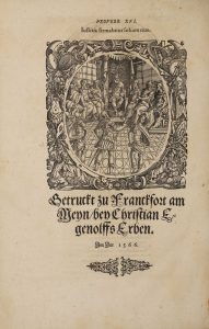 und Frantzosen ... Franckfort am Meyn, bei Christian Egen.[olffs] Erben, 1566. In-folio, [1] f. (dont le titre en rouge et noir), LXXXVI-[2] f. (le dernier blanc), [sign. 6, 4, A-O 6, P 4], ornements et lettrines, 3 portraits et 2 grandes vignettes, le tout gravé sur bois, demi-parchemin à coins XVIIIe s., dos à 4 nerfs, tr. mouchetées rouges (couvrure du dos manquante, griffures au plat sup., soigneuse restauration au titre).