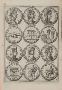LA QUADRA (Sebastian de) ; AGUSTIN (Antonio). Dialogos de medallas, inscriciones, y otras antiguedades. En Madrid, en la Off. de J.F. Martinez Abad, 1744. Petit in-4, [6] f., 470 p., portrait en frontispice, 1 pl. de figures, 51 planches de...
