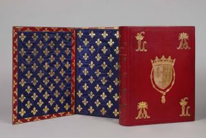 des armoiries d'Anne de Bretagne au centre, et de ses initiales couronnées aux angles, le tout doré, médaillon central et initiales de même au plat inférieur, double filet doré aux coupes, doublures et gardes de satin moiré bleu semé de fleurs de lys dorées, contreplats bordés de maroquin orné des mêmes fleurs de lys dorées, tranches dorées, chemises [Simier].