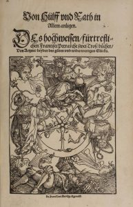[Livre illustré du XVIe s.]. PETRARQUE. Von Hülff und Rath in Allem anligen. Des hochweisen, fürtreflichen Francisci Petrarche, zwei Trost bücher, Von Artznei beydes des guuten und widerwertigen Glücks. Zu Franckfurt Bei Chr. Egenolff, 1551....