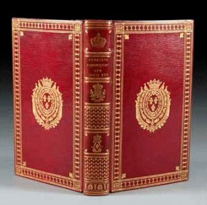 in-4, belle reliure de luxe en plein maroquin rouge signée en bas du dos « R.P. Thouvenin », plats frappé aux armes de CharlesPhilippe, comte d'Artois, dans un encadrement à double filets décoré de palmettes, dos à nerfs orné d'une couronne royale, des armes de France, du chiffre de Louis XVIII et d'un semi de fleurs de lys, titres en lettres d'or. Très bon état. Provenance : bibliothèque du comte d'Artois, futur roi Charles X et frère des rois Louis XVI et Louis XVIII.