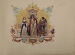- Allégorie du Théâtre " Comédie-Tragédie-Drame ". Aquarelle et rehauts d'or. Signée dans la planche et daté jr 1840. 28,6 × 40,2 cm.