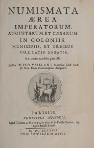 VAILLANT (Jean Foi). Numismata aerea imperatorum augustarum et caesarum in coloniis municipiis et urbibus jure latio donatis, ex omni modulo percussa. Parisiis, sumpt. auctoris, apud T. Moette, 1688. 2 vol. in-folio, [10] f., 346 p. + [1] f., 386 p.,...