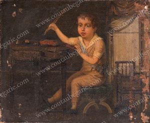 ECOLE FRANCAISE DU XVIIIe SIECLE. Portrait présumé du jeune prince Louis-Joseph, Dauphin de France (1781-1789) à sa table de travail. Huile sur toile. Usures du temps, nombreux accidents, en l'état. H. : 37 cm L.: 45 cm.