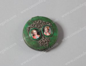 placé dans un écrin de forme ronde, gainé de roussette. Le couvercle à charnière est orné de deux portraits miniatures sur émail, représentant un couple. Usures et taches, mais bon état général. Diam. : 4, 5 cm. Ecrin : diam. : 6 cm.