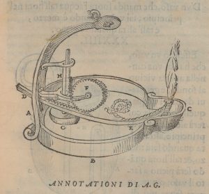 [Livre du XVIe s.]. HERON D'ALEXANDRIE ; GIORI (Alessandro). Spiritali di Herone Alessandrino ridotti in lingua volgare, da Alessandro Giorgi da Urbino. In Urbino, apresso B. & S. Ragusi, 1592. In-4, [4]-82 f., figures gravées sur bois dans le...
