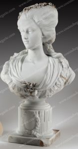 MARIE-LOUISE, princesse de Lamballe, née princesse de Savoie (1749-1792) Buste en biscuit la représentant avec un chapeau et une couronne de fleurs dans les cheveux, reposant sur un socle demi-colonne avec une couronne de laurier. Usures du temps...