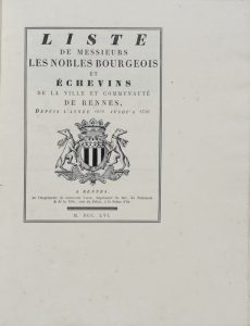 " Répartition des compagnies de la milice bourgeoise de la ville de Rennes ", 1721. Placard in-folio, armoiries gravées sur bois (rongé aux plis, qq. lettres manquent).